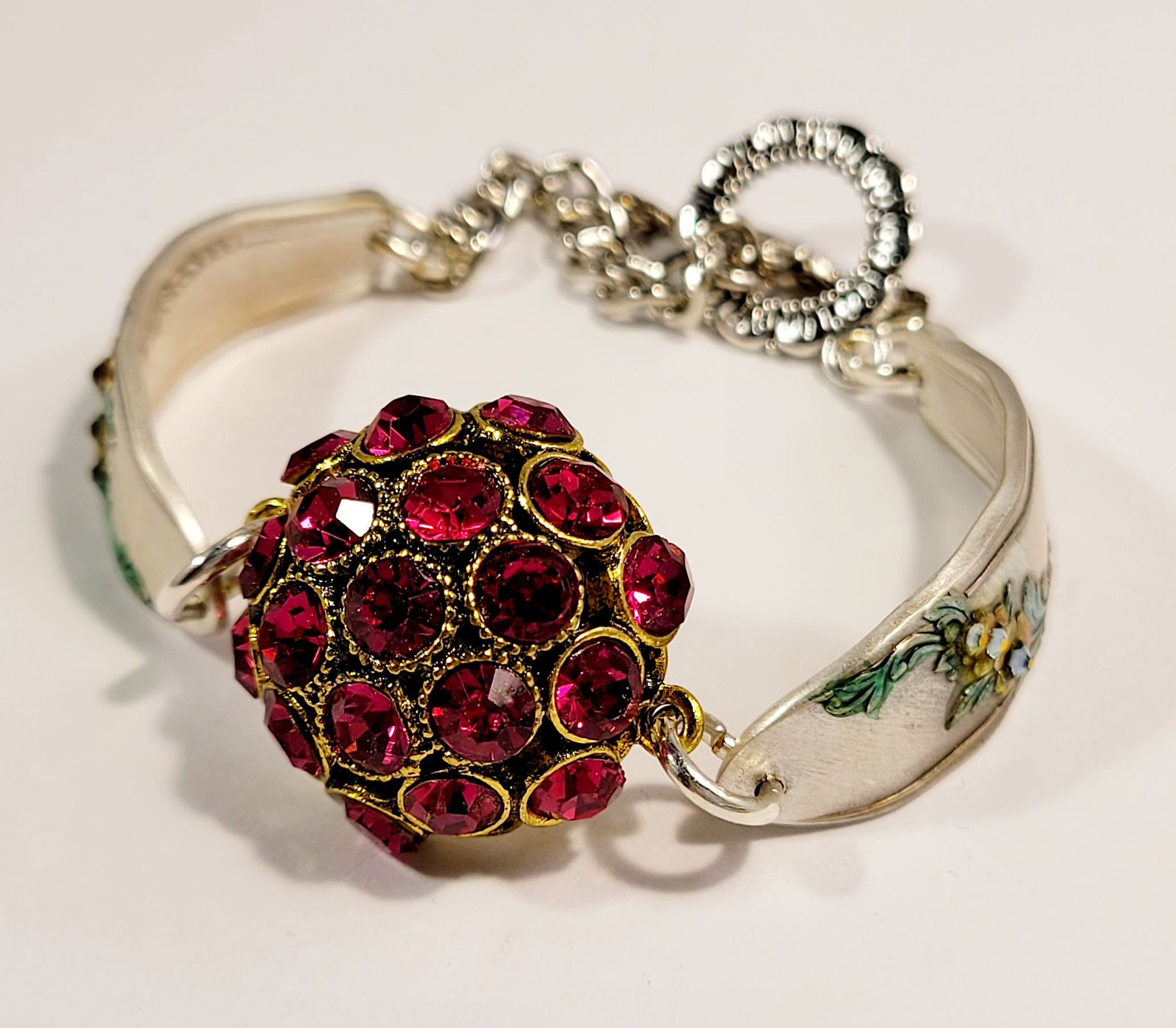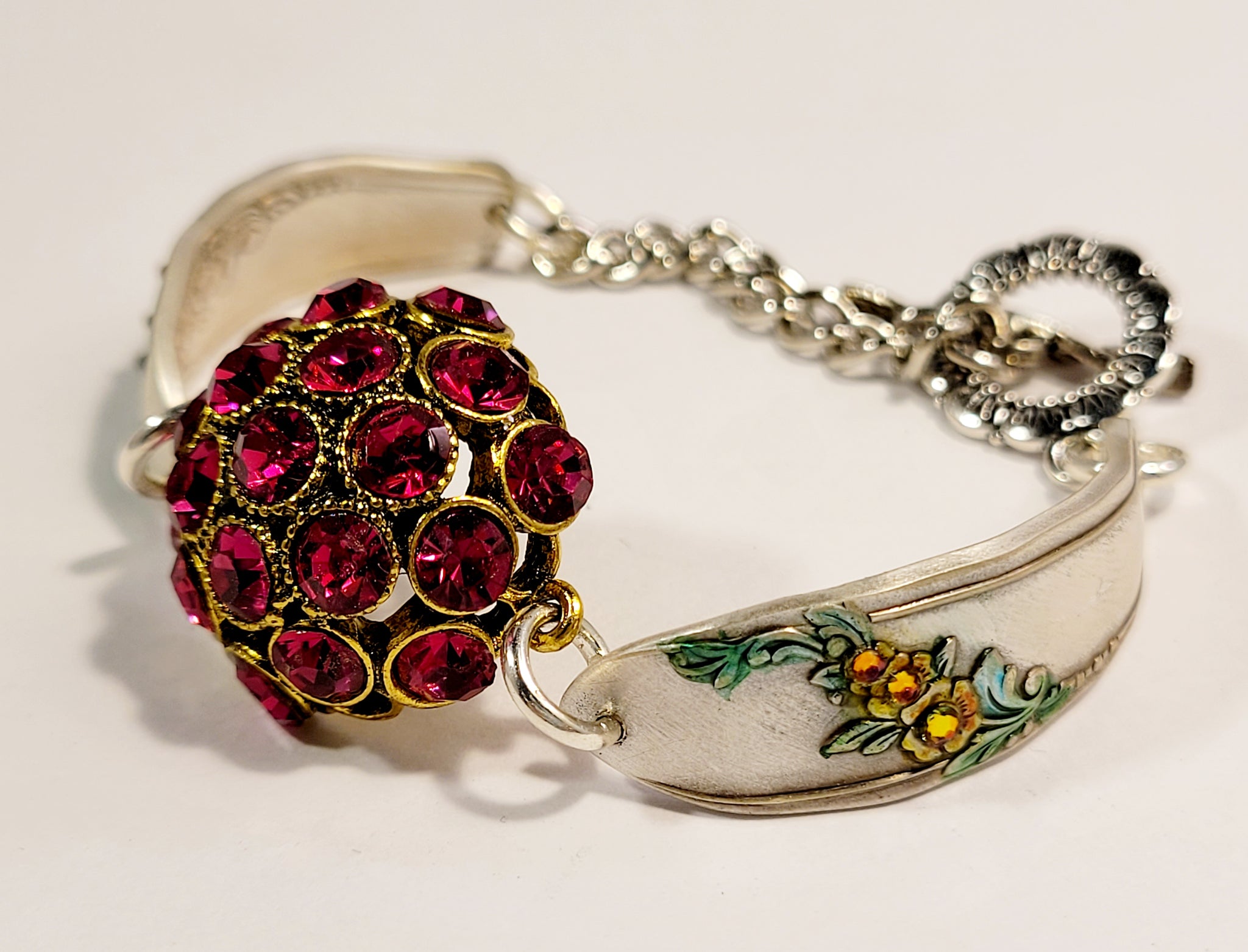 Handmade bracelet created with vintage silver plated spoons/silverware. Center is a half dome of magenta crystals. Bracelet sides are hand painted to enhance the spoon pattern and encrusted with crystals.